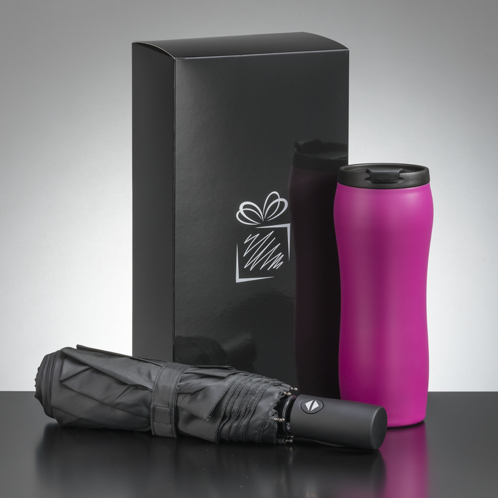 Ein praktisches Set für unterwegs, bestehend aus einem Vakuum-Thermobecher aus der Primo-Kollektion und einem faltbaren Automatikschirm. Der auslaufsichere Thermobecher besteht aus hochwertigem Edelstahl und ist mit einer matten Pulverbeschichtung versehen, die nicht nur Haltbarkeit, sondern auch ein tolles Aussehen bietet. Doppelwände halten die gewünschte Temperatur bis zu 6 Stunden lang perfekt. Der Klickverschluss hält Ihr Getränk heiß und sicher. Das Produkt ist für den Lebensmittelkontakt zertifiziert und BPA-frei. Der Faltschirm ist ein hochwertiges Produkt aus der Primo-Kollektion mit DAS (Double Automatic System – automatisches Schließen und Öffnen) und dem Anti-Wind-System. Merkmale: ein solider Metallrahmen, mit Glasfaser überzogene Rippen, ein mit PU überzogener Griff. Das Produkt ist REACH-zertifiziert. Das Set ist in einer eleganten schwarzen Kartonverpackung verpackt.