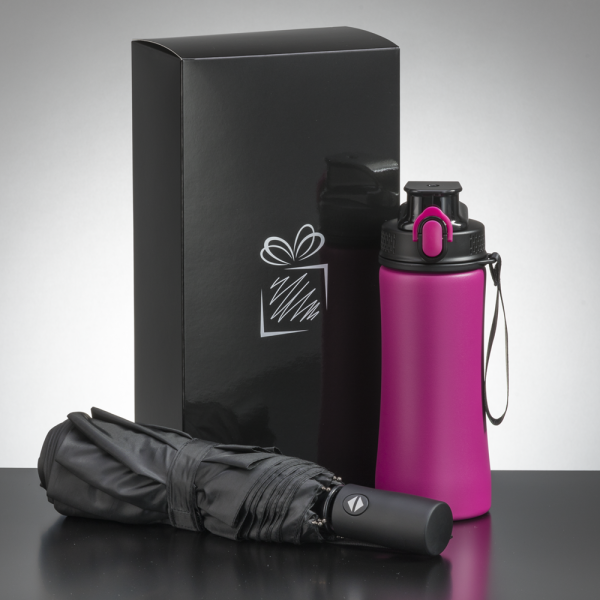 Ein praktisches Set, das im täglichen Gebrauch gut funktioniert, bestehend aus einer Stahlwasserflasche und einem automatischen Regenschirm aus der Primokollektion. Die Wasserflasche besteht sowohl an der Außen- als auch an der Innenschale aus robustem 18/8-Edelstahl in Lebensmittelqualität und gewährleistet so höchste Ansprüche an Qualität und Haltbarkeit. Dank seiner ergonomischen Form bietet das Produkt einen bequemen und sicheren Halt. Das innovative Design umfasst einen praktischen Ein-Klick-Öffnungsmechanismus für schnellen und einfachen Zugriff auf Ihr Getränk. Wenn Sie die Flasche nicht verwenden, können Sie den Verschluss verschließen, um ein Auslaufen des Inhalts zu verhindern. Der Faltschirm ist ein hochwertiges Produkt aus der Primo-Kollektion mit DAS (Double Automatic System – automatisches Schließen und Öffnen) und dem Anti-Wind-System. Der Schirm verfügt über einen soliden Metallrahmen, mit Glasfaser überzogene Rippen und einen mit PU überzogenen Griff. Der Regenschirm passt perfekt in eine Handtasche oder einen Rucksack. Das Produkt ist REACH-zertifiziert. Das Set ist in einer eleganten schwarzen Kartonverpackung verpackt.
