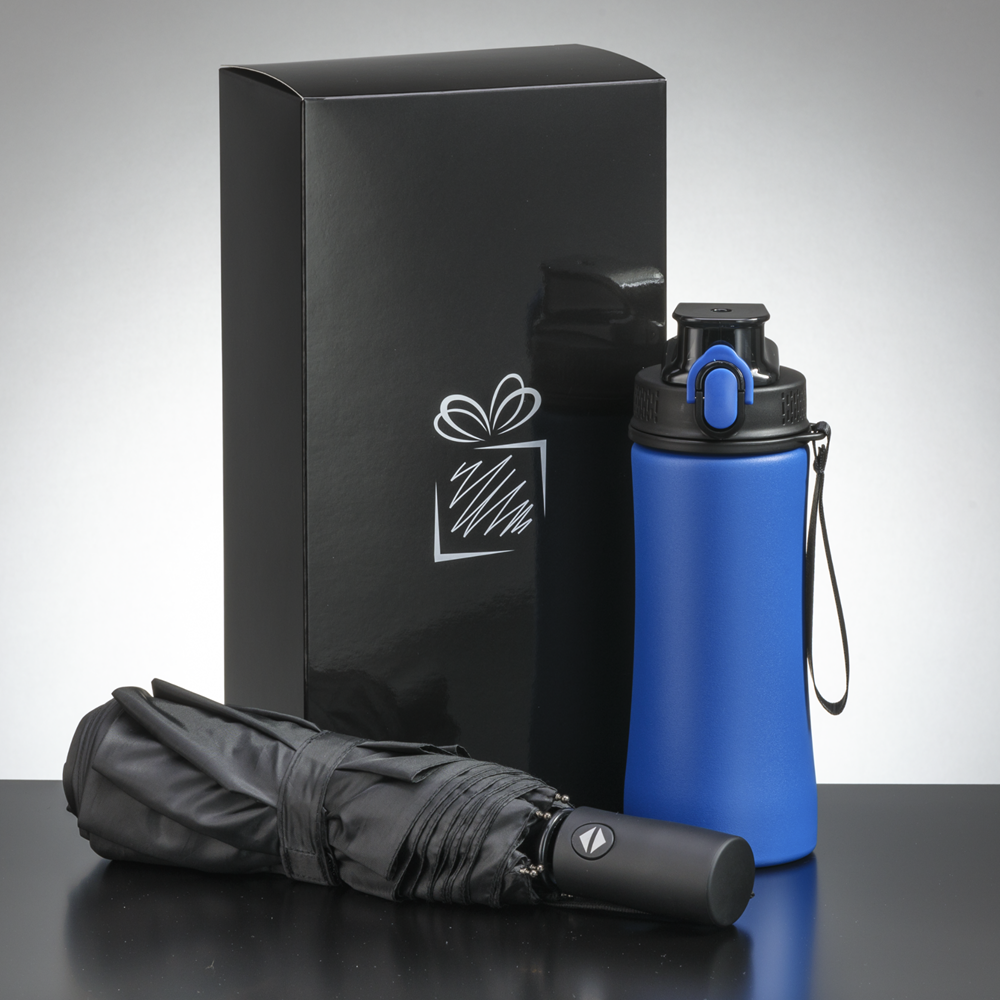 Ein praktisches Set, das im täglichen Gebrauch gut funktioniert, bestehend aus einer Stahlwasserflasche und einem automatischen Regenschirm aus der Primokollektion. Die Wasserflasche besteht sowohl an der Außen- als auch an der Innenschale aus robustem 18/8-Edelstahl in Lebensmittelqualität und gewährleistet so höchste Ansprüche an Qualität und Haltbarkeit. Dank seiner ergonomischen Form bietet das Produkt einen bequemen und sicheren Halt. Das innovative Design umfasst einen praktischen Ein-Klick-Öffnungsmechanismus für schnellen und einfachen Zugriff auf Ihr Getränk. Wenn Sie die Flasche nicht verwenden, können Sie den Verschluss verschließen, um ein Auslaufen des Inhalts zu verhindern. Der Faltschirm ist ein hochwertiges Produkt aus der Primo-Kollektion mit DAS (Double Automatic System – automatisches Schließen und Öffnen) und dem Anti-Wind-System. Der Schirm verfügt über einen soliden Metallrahmen, mit Glasfaser überzogene Rippen und einen mit PU überzogenen Griff. Der Regenschirm passt perfekt in eine Handtasche oder einen Rucksack. Das Produkt ist REACH-zertifiziert. Das Set ist in einer eleganten schwarzen Kartonverpackung verpackt.
