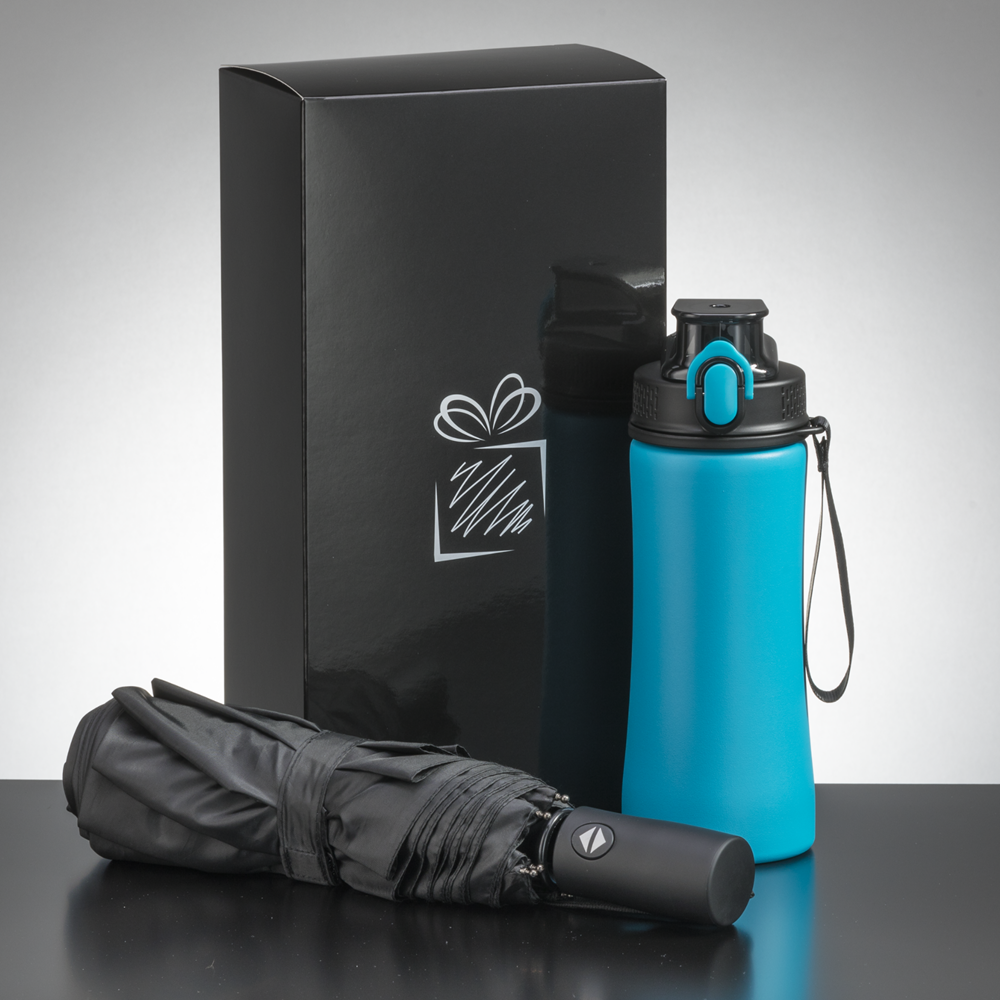 Ein praktisches Set, das im täglichen Gebrauch gut funktioniert, bestehend aus einer Stahlwasserflasche und einem automatischen Regenschirm aus der Primokollektion. Die Wasserflasche besteht sowohl an der Außen- als auch an der Innenschale aus robustem 18/8-Edelstahl in Lebensmittelqualität und gewährleistet so höchste Ansprüche an Qualität und Haltbarkeit. Dank seiner ergonomischen Form bietet das Produkt einen bequemen und sicheren Halt. Das innovative Design umfasst einen praktischen Ein-Klick-Öffnungsmechanismus für schnellen und einfachen Zugriff auf Ihr Getränk. Wenn Sie die Flasche nicht verwenden, können Sie den Verschluss verschließen, um ein Auslaufen des Inhalts zu verhindern. Der Faltschirm ist ein hochwertiges Produkt aus der Primo-Kollektion mit DAS (Double Automatic System – automatisches Schließen und Öffnen) und dem Anti-Wind-System. Der Schirm verfügt über einen soliden Metallrahmen, mit Glasfaser überzogene Rippen und einen mit PU überzogenen Griff. Der Regenschirm passt perfekt in eine Handtasche oder einen Rucksack. Das Produkt ist REACH-zertifiziert. Das Set ist in einer eleganten schwarzen Kartonverpackung verpackt.