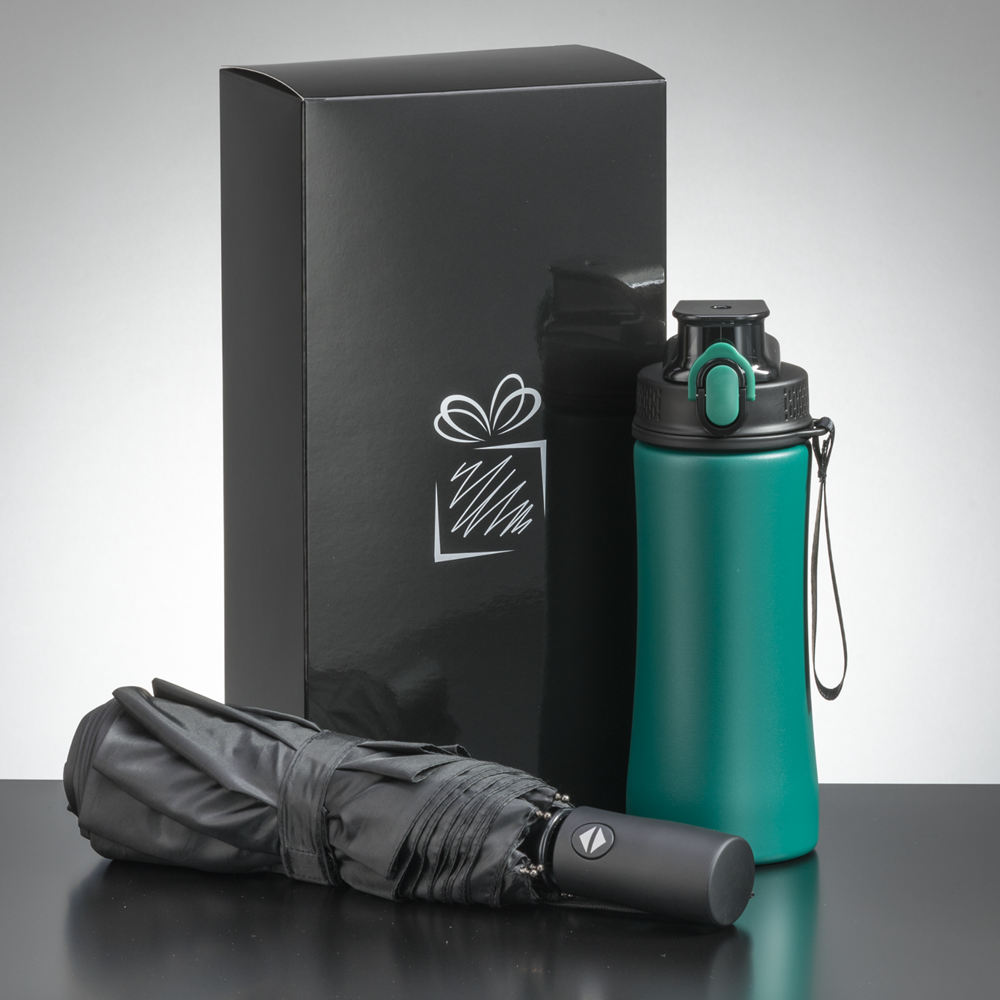 Ein praktisches Set, das im täglichen Gebrauch gut funktioniert, bestehend aus einer Stahlwasserflasche und einem automatischen Regenschirm aus der Primokollektion. Die Wasserflasche besteht sowohl an der Außen- als auch an der Innenschale aus robustem 18/8-Edelstahl in Lebensmittelqualität und gewährleistet so höchste Ansprüche an Qualität und Haltbarkeit. Dank seiner ergonomischen Form bietet das Produkt einen bequemen und sicheren Halt. Das innovative Design umfasst einen praktischen Ein-Klick-Öffnungsmechanismus für schnellen und einfachen Zugriff auf Ihr Getränk. Wenn Sie die Flasche nicht verwenden, können Sie den Verschluss verschließen, um ein Auslaufen des Inhalts zu verhindern. Der Faltschirm ist ein hochwertiges Produkt aus der Primo-Kollektion mit DAS (Double Automatic System – automatisches Schließen und Öffnen) und dem Anti-Wind-System. Der Schirm verfügt über einen soliden Metallrahmen, mit Glasfaser überzogene Rippen und einen mit PU überzogenen Griff. Der Regenschirm passt perfekt in eine Handtasche oder einen Rucksack. Das Produkt ist REACH-zertifiziert. Das Set ist in einer eleganten schwarzen Kartonverpackung verpackt.