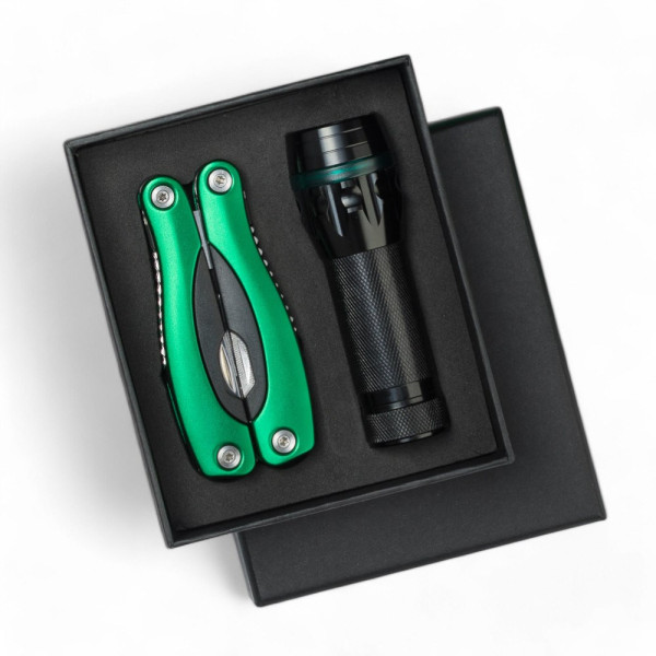 Ein praktisches Set bestehend aus einer Taschenlampe und einem großen Multitool. Die Taschenlampe besteht aus Aluminium und gibt einen fokussierten Lichtstrahl ab. Ein professionelles und praktisches Multifunktionswerkzeug, das mit einem professionellen Federsystem und einer Safe-Funktion ausgestattet ist, die ein versehentliches Schließen der Klingen verhindert. Das Set ist in einer eleganten Box verpackt.