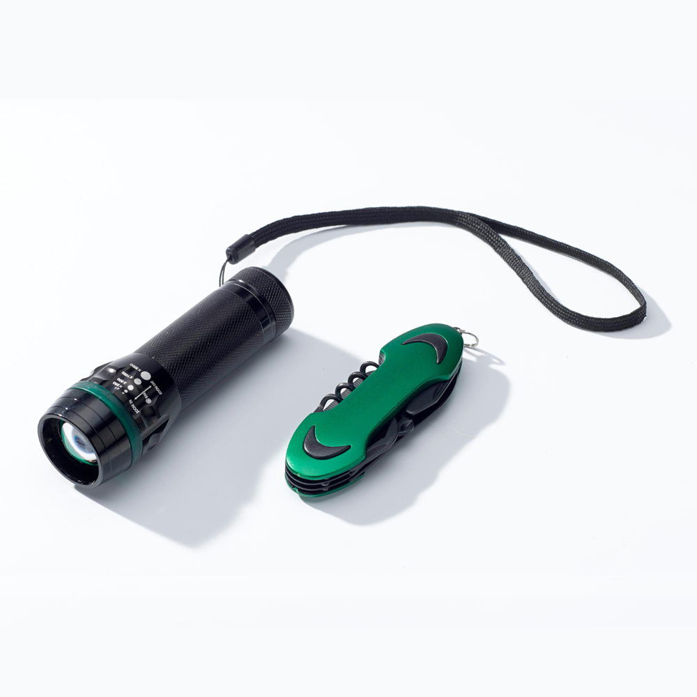 Ein praktisches Set bestehend aus einer Taschenlampe und einem Taschenmesser enthält. Die Taschenlampe wird von einer LED-Diode versorgt. Hergestellt aus Aluminium. Erzeugt fokussiertes Licht. Das Taschenmesser besitzt einen Klappgriff, einen eingebauten Korkenzieher, einen Flaschenöffner, einen Schraubendreher, eine Nagelfeile und eine Schere. Das Set ist in der Werksverpackung verpackt.