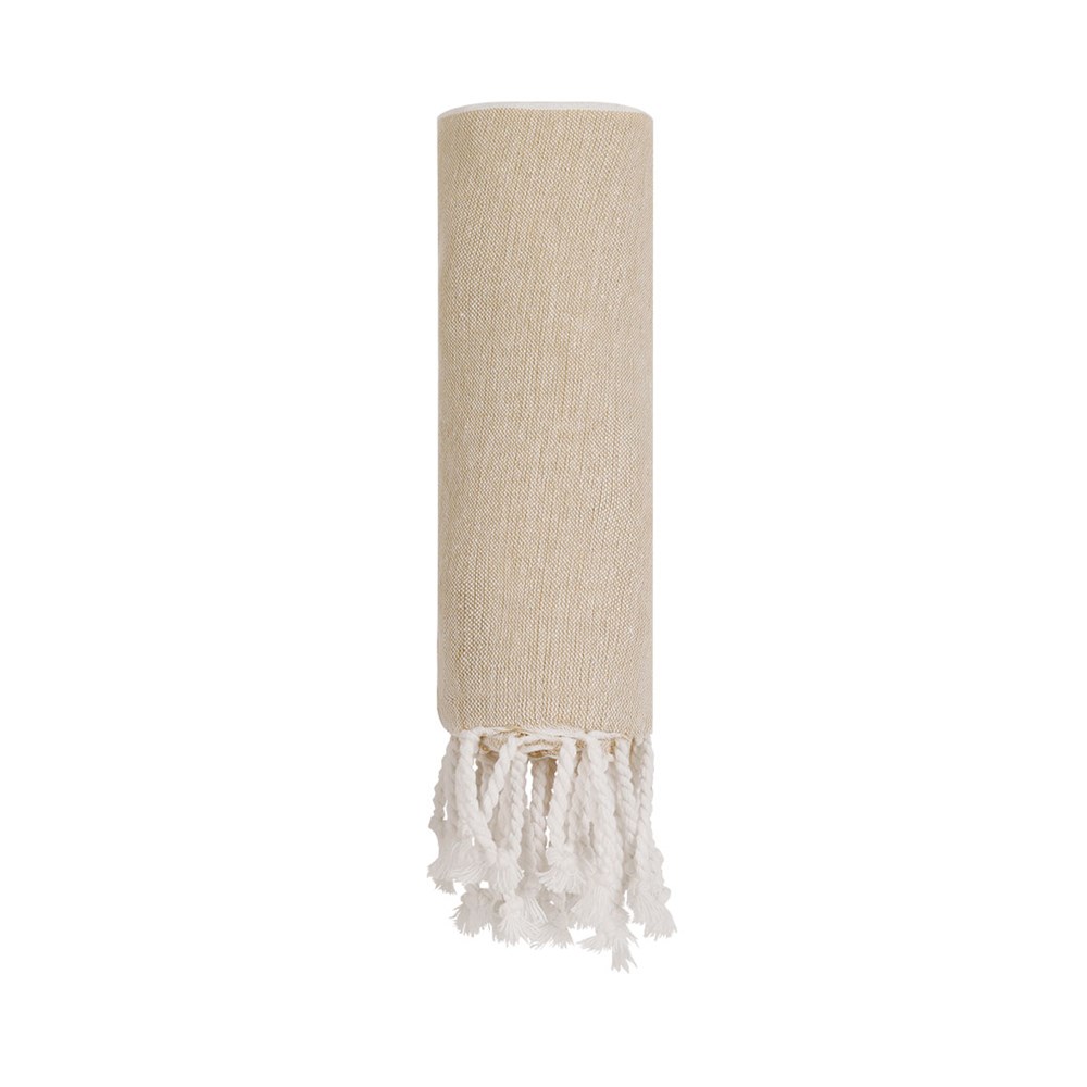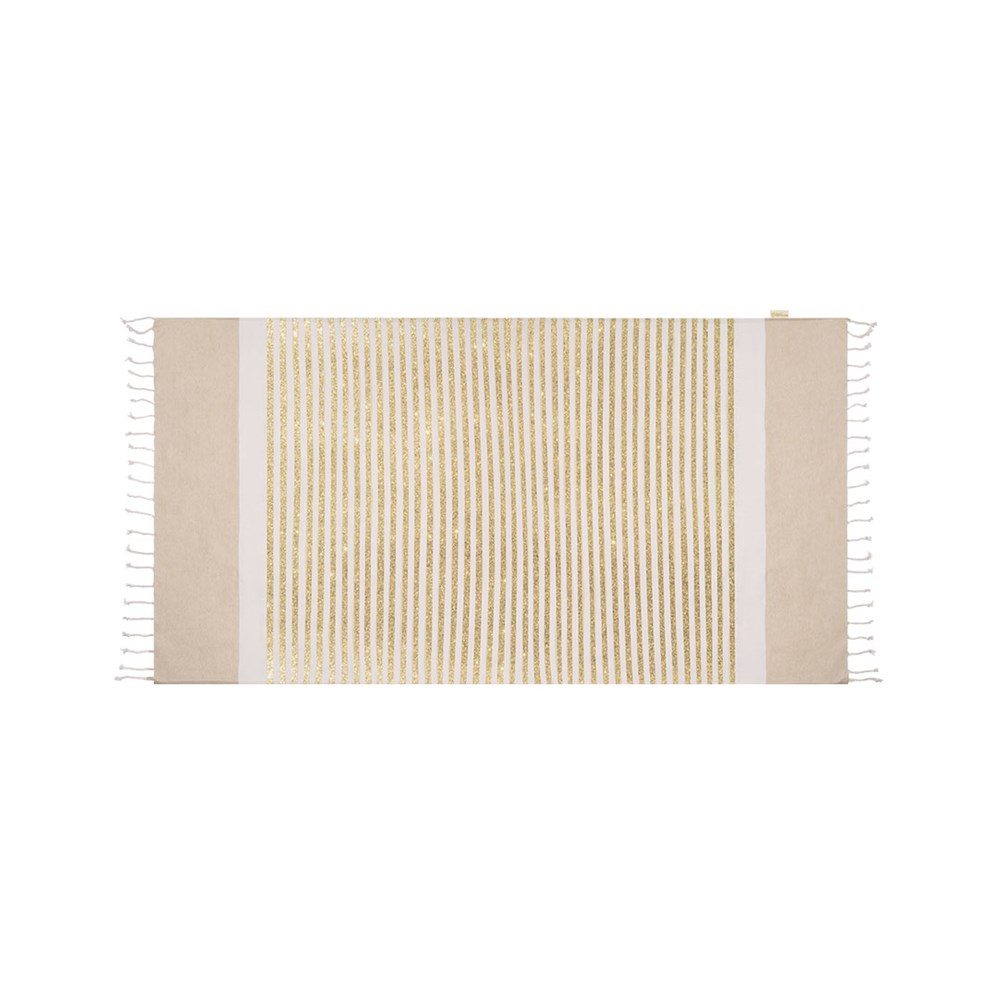 Bademantel in recycled Baumwolle von 180 g/m2. Gestreiftes Design in weißer Kombination mit glitzernden goldenen Streifen, Enden in glattem Beige und ausgefallenen Fransen an den Enden in Kordel-Optik. Enthält ein Etikett mit dem Logo für recycelte Baumwolle.