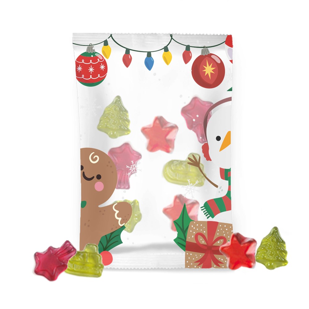 Weihnachts-Fruchtgummi in transparenter Folie mit ca. 10 Gramm Fruchtgummi mehr