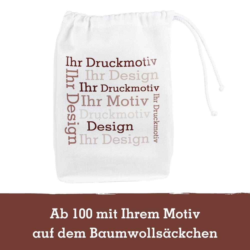 Ab 100 Stück mit Ihrem Motiv auf dem Baumwollsäckchen: Wählen Sie aus einem breiten Sortiment von edlen Nüssen, verführerischer Schokolade und Trockenfrüchten. Mit Liebe konfektioniert in Deutschland. Sie suchen eine andere Größe? Dieses Premium Präsent ist auch mit 1 oder 2 Faltschachteln erhältlich.