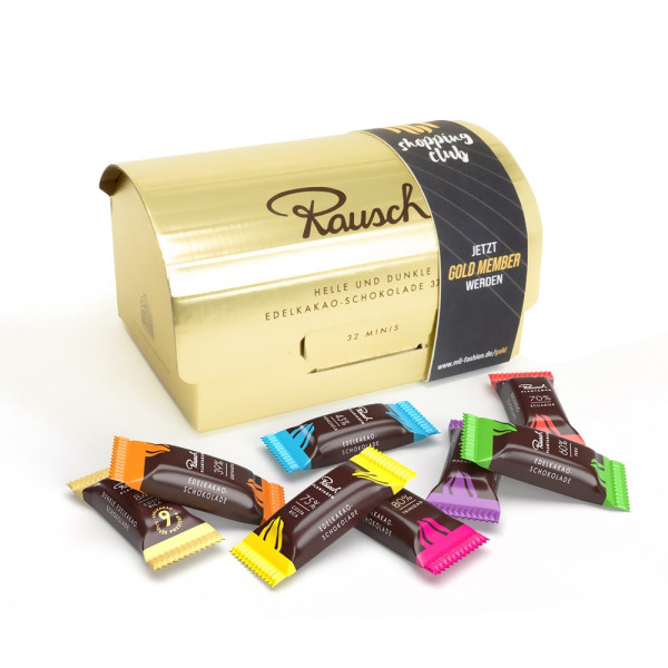 Hochwertige Goldbox mit 32 "Rausch Plantagen" Minis aus 9 Sorten heller und dunkler Edelkakao-Schokolade - probieren Sie mit dieser Box die gesamte Vielfalt der "Rausch Plantagen". Ob als Geschenk oder zum gemeinsamen Genießen eines besonderen Moments - passend für alle Schokoladen-Liebhaber. Veredelt im indiviuell bedruckten Schuber aus FSC®-zertifiziertem Karton.