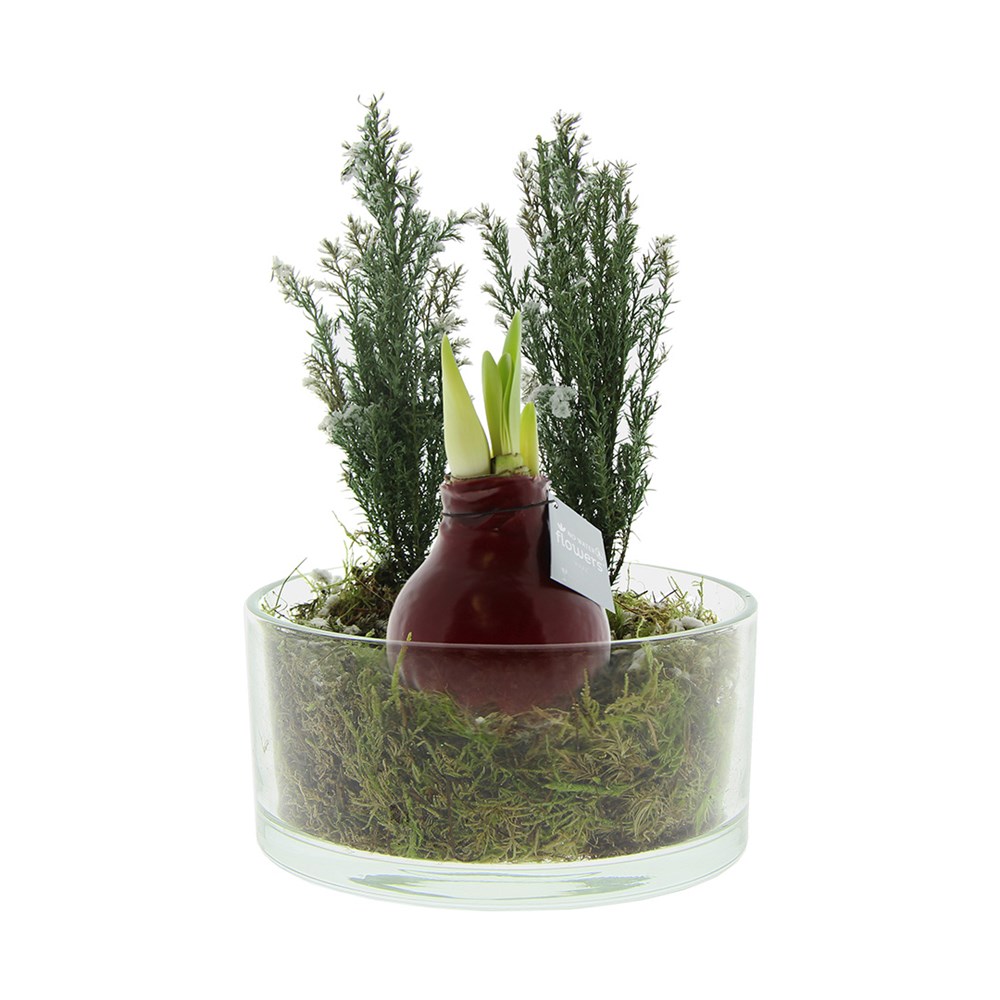 No Water Flowers® sind ein luxuriöses, wachsendes und blühendes Geschenk. Die lebenden No Water Flowers® sind bekannt für ihre einzigartigen handgefertigten Wachs-Amaryllis-Zwiebeln. Diese speziell ausgewählten und getesteten Amaryllis-Zwiebeln haben genug Energie, um ohne Wasser zu wachsen und zu blühen. Authentische No Water Flowers® haben relativ kurze Blütenstiele, fallen nicht um und blühen garantiert. Jede No Water Flowers® wird sorgfältig gereinigt und perfekt gewachst. Dadurch erhält die Blumenzwiebel ein zeitgemäßes und modisches Aussehen. Diese luxuriöse No Water Flowers®-Anordnung besteht aus 2 Mini-Weihnachtsbäumen und einer originalen No Water Flowers. Gefüllt mit Moos und Erde entsteht ein einzigartiges grünes Paket. Diese Anordnung gehört zu den luxuriösesten und gleichzeitig umweltfreundlichsten Weihnachtsgeschenken, die es gibt.