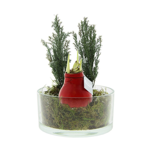 No Water Flowers® sind ein luxuriöses, wachsendes und blühendes Geschenk. Die lebenden No Water Flowers® sind bekannt für ihre einzigartigen handgefertigten Wachs-Amaryllis-Zwiebeln. Diese speziell ausgewählten und getesteten Amaryllis-Zwiebeln haben genug Energie, um ohne Wasser zu wachsen und zu blühen. Authentische No Water Flowers® haben relativ kurze Blütenstiele, fallen nicht um und blühen garantiert. Jede No Water Flowers® wird sorgfältig gereinigt und perfekt gewachst. Dadurch erhält die Blumenzwiebel ein zeitgemäßes und modisches Aussehen. Diese luxuriöse No Water Flowers®-Anordnung besteht aus 2 Mini-Weihnachtsbäumen und einer originalen No Water Flowers. Gefüllt mit Moos und Erde entsteht ein einzigartiges grünes Paket. Diese Anordnung gehört zu den luxuriösesten und gleichzeitig umweltfreundlichsten Weihnachtsgeschenken, die es gibt.