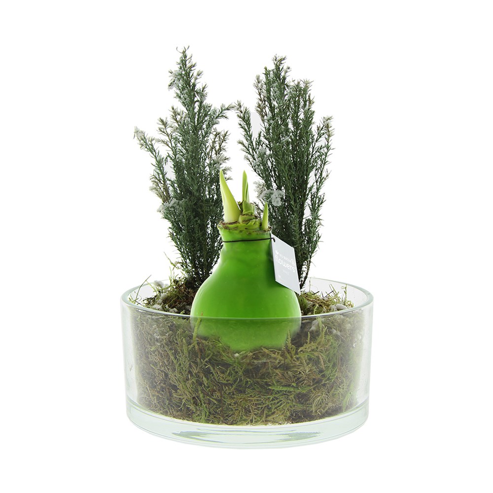 No Water Flowers® sind ein luxuriöses, wachsendes und blühendes Geschenk. Die lebenden No Water Flowers® sind bekannt für ihre einzigartigen handgefertigten Wachs-Amaryllis-Zwiebeln. Diese speziell ausgewählten und getesteten Amaryllis-Zwiebeln haben genug Energie, um ohne Wasser zu wachsen und zu blühen. Authentische No Water Flowers® haben relativ kurze Blütenstiele, fallen nicht um und blühen garantiert. Jede No Water Flowers® wird sorgfältig gereinigt und perfekt gewachst. Dadurch erhält die Blumenzwiebel ein zeitgemäßes und modisches Aussehen. Diese luxuriöse No Water Flowers®-Anordnung besteht aus 2 Mini-Weihnachtsbäumen und einer originalen No Water Flowers. Gefüllt mit Moos und Erde entsteht ein einzigartiges grünes Paket. Diese Anordnung gehört zu den luxuriösesten und gleichzeitig umweltfreundlichsten Weihnachtsgeschenken, die es gibt.