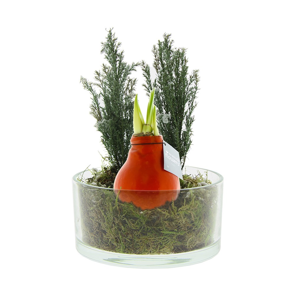 No Water Flowers® sind ein luxuriöses, wachsendes und blühendes Geschenk. Die lebenden No Water Flowers® sind bekannt für ihre einzigartigen handgefertigten Wachs-Amaryllis-Zwiebeln. Diese speziell ausgewählten und getesteten Amaryllis-Zwiebeln haben genug Energie, um ohne Wasser zu wachsen und zu blühen. Authentische No Water Flowers® haben relativ kurze Blütenstiele, fallen nicht um und blühen garantiert. Jede No Water Flowers® wird sorgfältig gereinigt und perfekt gewachst. Dadurch erhält die Blumenzwiebel ein zeitgemäßes und modisches Aussehen. Diese luxuriöse No Water Flowers®-Anordnung besteht aus 2 Mini-Weihnachtsbäumen und einer originalen No Water Flowers. Gefüllt mit Moos und Erde entsteht ein einzigartiges grünes Paket. Diese Anordnung gehört zu den luxuriösesten und gleichzeitig umweltfreundlichsten Weihnachtsgeschenken, die es gibt.