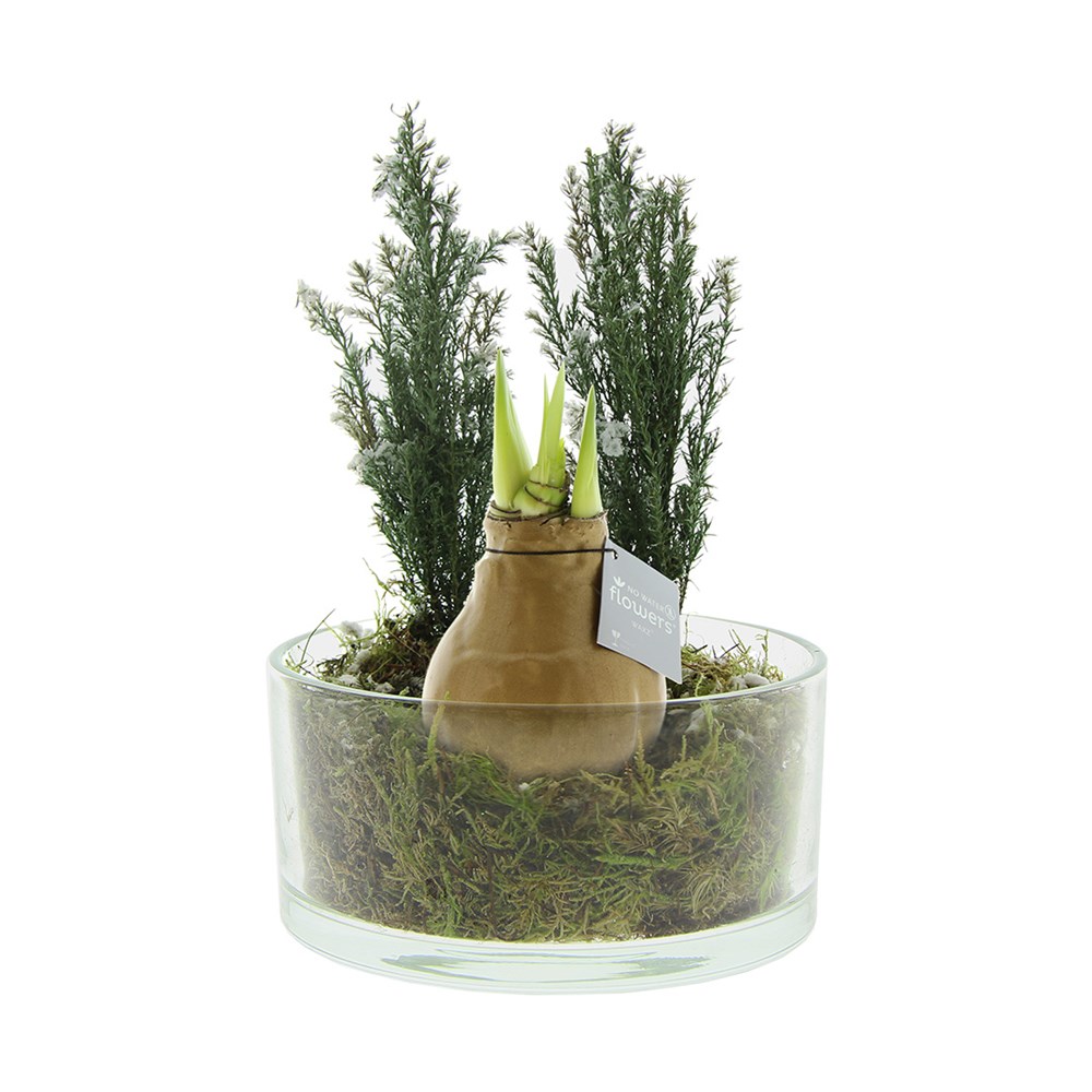 No Water Flowers® sind ein luxuriöses, wachsendes und blühendes Geschenk. Die lebenden No Water Flowers® sind bekannt für ihre einzigartigen handgefertigten Wachs-Amaryllis-Zwiebeln. Diese speziell ausgewählten und getesteten Amaryllis-Zwiebeln haben genug Energie, um ohne Wasser zu wachsen und zu blühen. Authentische No Water Flowers® haben relativ kurze Blütenstiele, fallen nicht um und blühen garantiert. Jede No Water Flowers® wird sorgfältig gereinigt und perfekt gewachst. Dadurch erhält die Blumenzwiebel ein zeitgemäßes und modisches Aussehen. Diese luxuriöse No Water Flowers®-Anordnung besteht aus 2 Mini-Weihnachtsbäumen und einer originalen No Water Flowers. Gefüllt mit Moos und Erde entsteht ein einzigartiges grünes Paket. Diese Anordnung gehört zu den luxuriösesten und gleichzeitig umweltfreundlichsten Weihnachtsgeschenken, die es gibt.