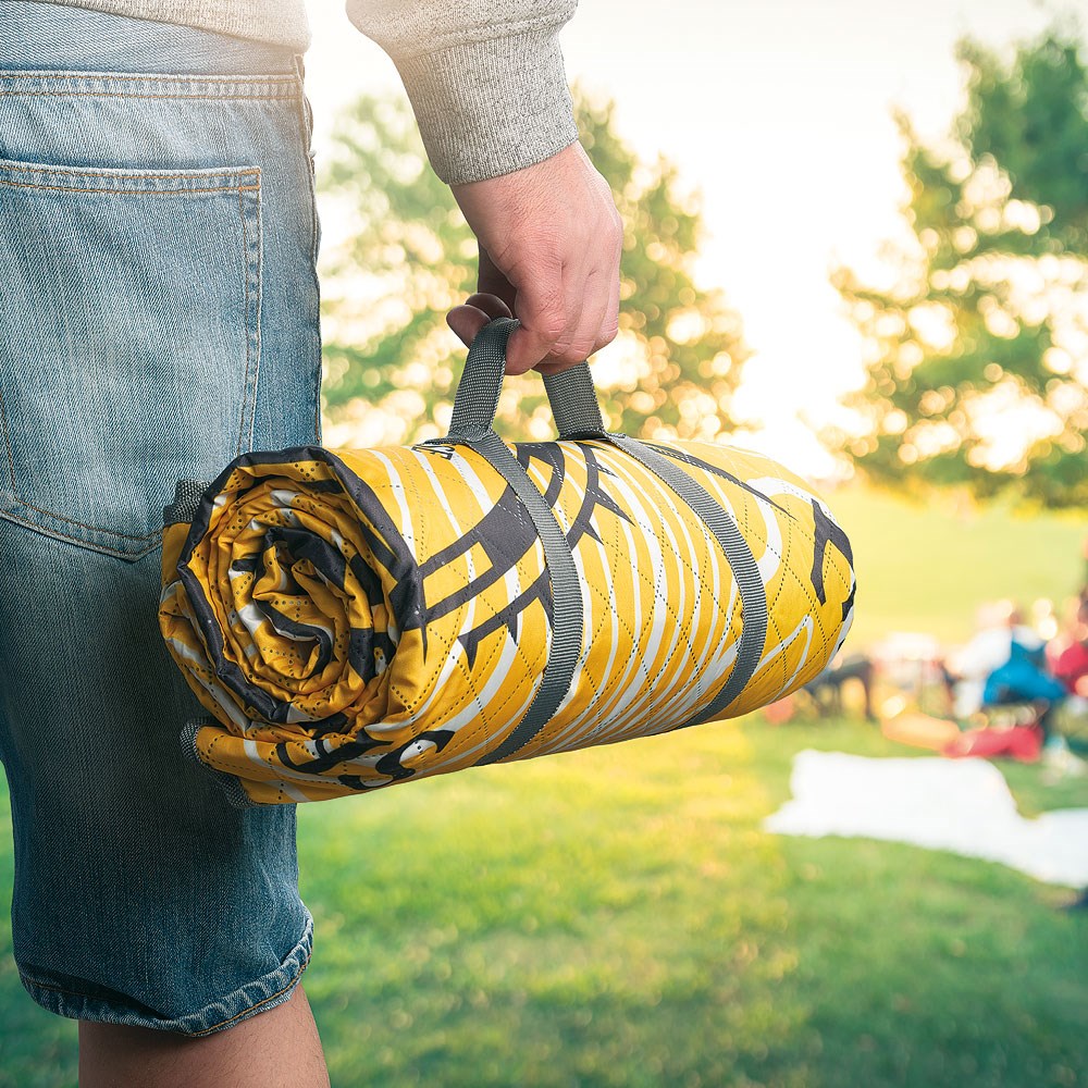 Wasserabweisende Picknickdecke, die Sie auf Ihrem Ausflug, beim Festival oder im Garten verwenden können. Die Decke hat praktische Nylongurte, mit denen Sie die Decke schnell zusammenrollen und Tragen können. Material: 230D wasserfester Mikrofaser-Pongee, 210D wasserfester Polyester, Füllung – 150 g/m² hohle Polyesterfaser Empfohlene Veredelungstechnik: Siebdruck S3 Maximale Veredelungsgröße: 80 × 50 mm Abmessungen: 170 × 140 cm