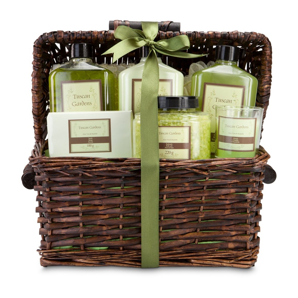 Das Geschenk-Set Arezzo entführt Sie zu einem traumhaften Wellness-Erlebnis in die Toskana: je 255 ml Duschgel, Bodylotion, Schaumbad, eine Kerze, 220 g Badesalz, 100 g Seife und je ein Sisal- und Mesh-Schwamm werden Sie verwöhnen. Der herrliche Duft der Badezusätze nach Aloe Vera und Kamille komplettiert das Badeerlebnis und garantiert Entspannung pur! Das XXL Geschenkset kommt ansprechend verpackt in einem hochwertigen Weidenkorb.