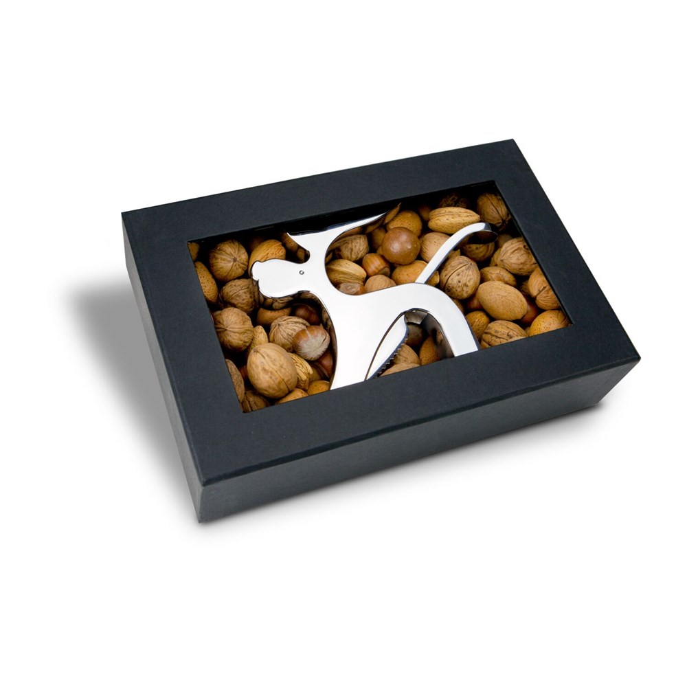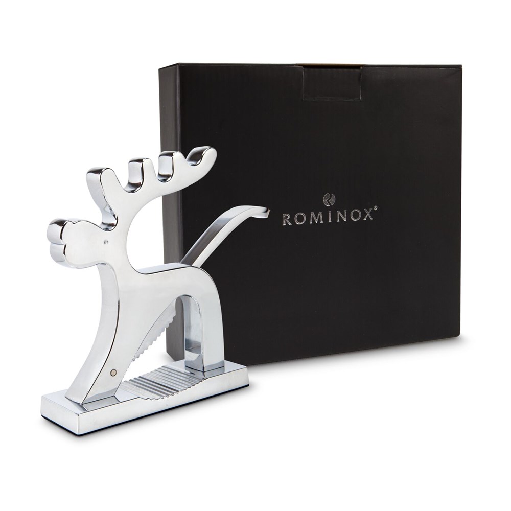 Sie können gleich loslegen: Der hochwertige, massive ROMINOX® Rentier-Nussknacker mit Federung liegt in 800 g Nüssen. Verpackt in schönem schwarzen Sichtfensterkarton.