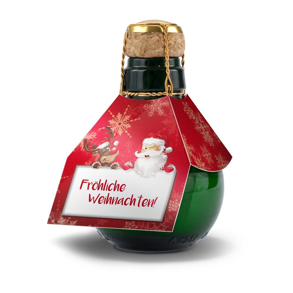 Klein aber fein - auch so können Sie fröhliche Weihnachten wünschen! Die kleinste Sektflasche der Welt mit 0,125 l Sekt brut und „Fröhliche Weihnachten” Manschette. Auch ohne rote Schmuckwelle erhätlich. Alkohol 12,5% Vol. zzgl. 0,17 € Schaumweinsteuer in Deutschland!