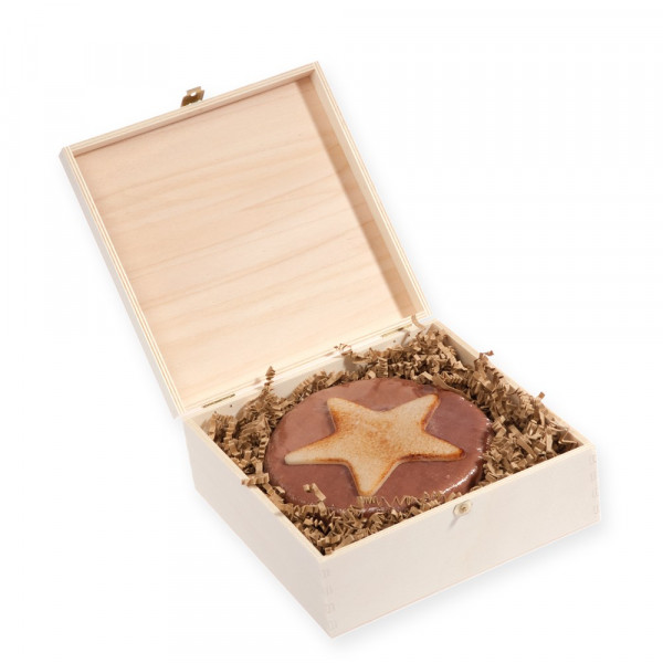 Originelle Weihnachtstorte mit Lebkuchengeschmack – dekorativ eingeschlagen in Mandel- und Schokoladenmarzipan. Die Torte wird zusätzlich in Klarsichtfolie aromaversiegelt und auf einer edlen Goldkartonage angerichtet. Die elegante Holzbox, deren Deckel auf Wunsch auch individualisiert werden kann, garantiert sicheren Versand und einen maximalen Überraschungseffekt beim Empfänger.