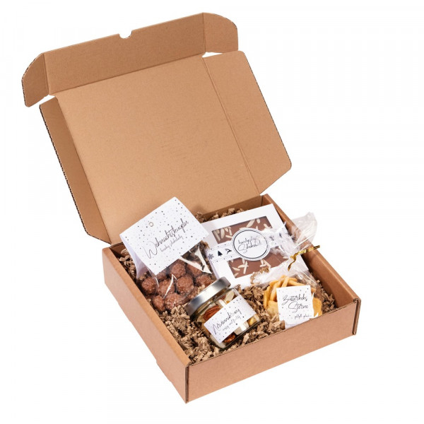 Fix und Fertig vorbereitet für Ihre Kunden. Die stabile Box aus Naturkarton ist perfekt für den Einzelversand geeignet. Gerne können Sie uns auch Grußkarten stellen, die optional beigelegt werden könnnen. Auch ein Sammelversand an Ihre gesamte Belegschaft ist kein Problem. In der Box befindet sich ein wahres Feuerwerk an geschmacksvollen Präsenten.