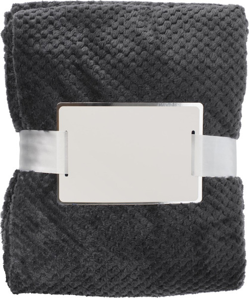 Decke aus Flanellvlies (230 gr/m²) mit Waffelmuster. Verpackung mit Schleife und Kartoneinlage zum Bedrucken. Größe: 120 x 150 cm.